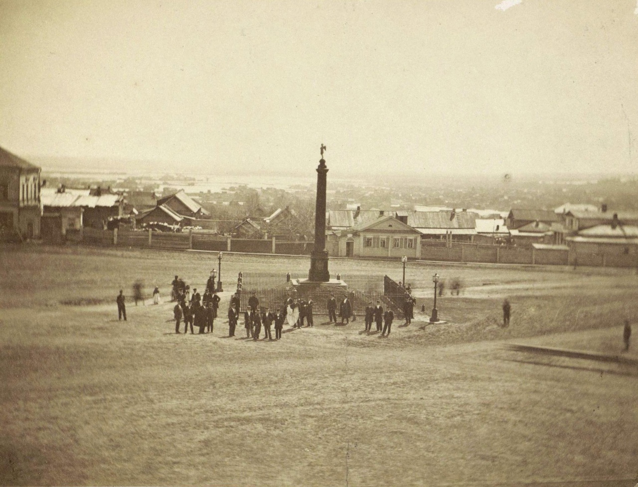 Памятник Великому Князю Михаилу Павловичу на соборной площади Ижевского завода. Снимок сделан из окна здания Военного собрания (Горького 73). У левого края виден дом Новикова (Горького 69). В будущим вокруг колонны разобьют сад. Ангел на вершине колонны смотрит в сторону собора Александра Невского. Фото последней четверти XIX века. Вода на заднем плане - разлив Ижа и Позими. Пруд по правую руку от фотографа.