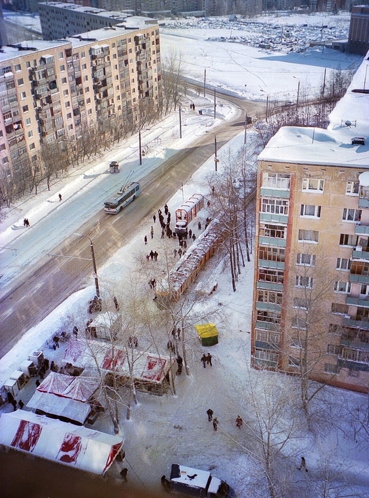 Вид на 4 микрорайон "Автозавода". 1981 г. Автор фото А.Р. Мозолюк. По центру дом Петрова 16. Слева Петрова 27, Устиновский РОВД. ТРК Петровского еще нет.