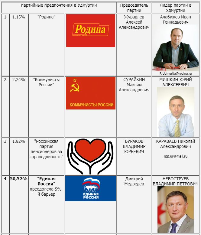 По итогам выборов наша республика получила 5 мандатов в новом созыве Госдумы. Все они представляют партию ЕР. По спискам партии прошли мэр Перми Игорь Сапко (Удмуртия и Пермский край были объединены в один список кандидатов), вице-спикер Госдумы РФ Андрей Исаев и зам. председателя комитета Госдумы Алексей Василенко.