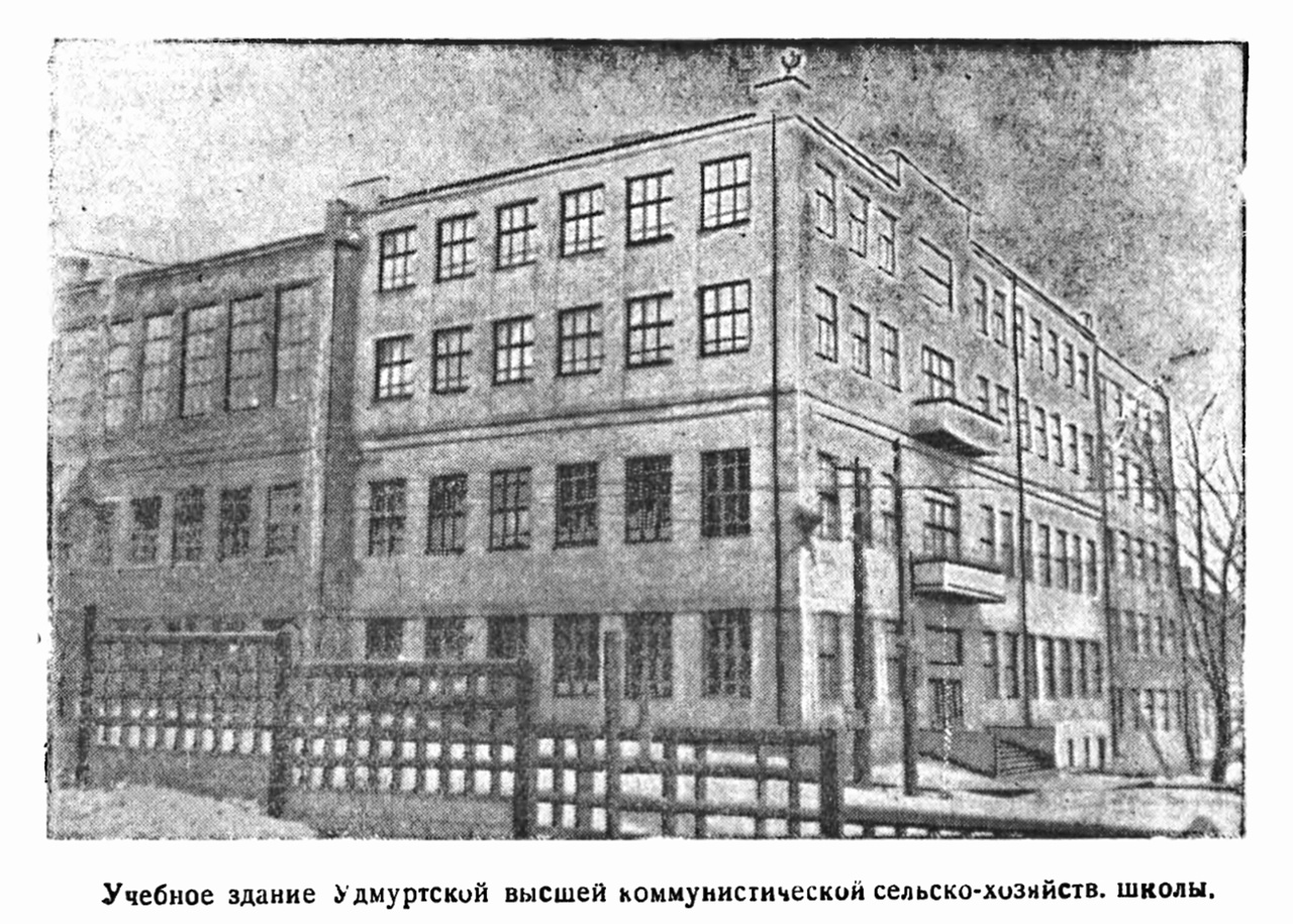 Надстроенное и расширенное здание одного из корпусов Женской гимназии, тогда — Высшая коммунистическая сельхозшкола, сейчас — 4-й корпус УдГАУ (2025). Ул. Свердлова 30 Ижевск. середины 1930-х годов.