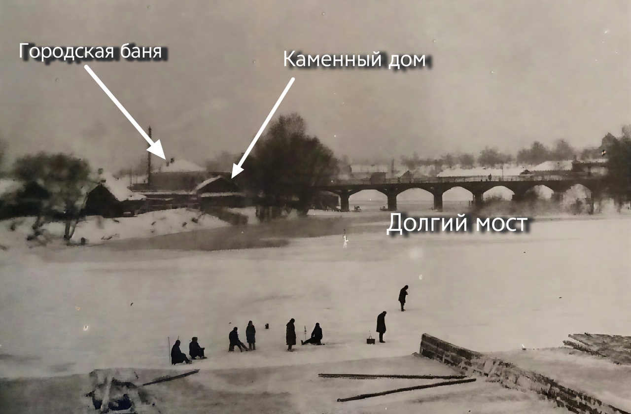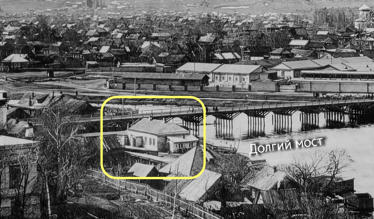Дом Свердлова 20 (в рамке) у Долгого моста на снимке 1912 года. Владела им в те годы артель «Металлист».