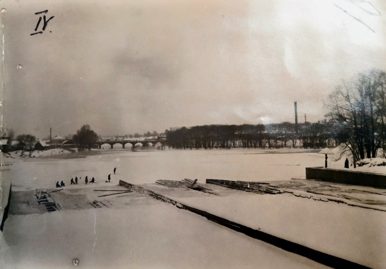 Старый Долгий мост, слева от которого стоит двухэтажная городская «колупаевская» баня. Деревянный водосброс плотины на реке Иж. Справа караульный "грибок" и часовой в тулупе. Начало 1930 года. Фонд Центрального госархива р-543.
